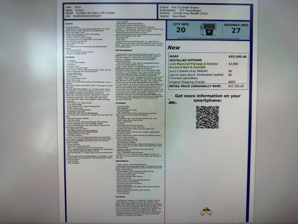Explore the perfect blend of versatility and luxury with this 2016 Subaru Outback Limited. Designed for adventure and comfort, this model is equipped with Subaru's renowned All-Wheel Drive system, ensuring exceptional stability and control in diverse driving conditions. Under the hood, its robust 6-cylinder, 3.6-liter engine delivers a dynamic driving experience, offering both power and efficiency for your daily commute or weekend getaways.
