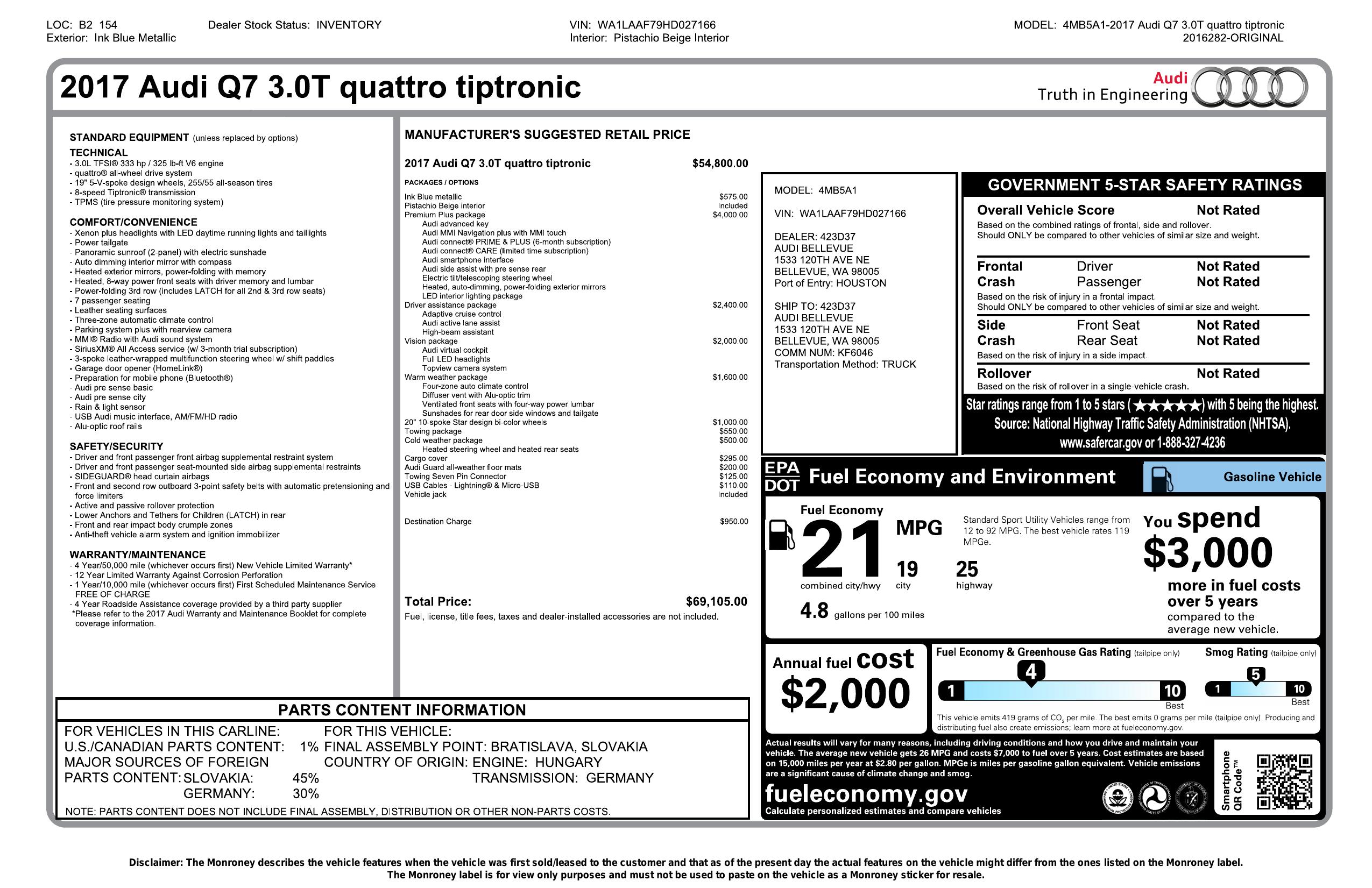 Located in Spokane, WA, this Audi Q7 is competitively priced — the best price for this model and trim in the area. Don't miss the opportunity to own a well-maintained, feature-rich luxury SUV that stands out for value and performance. Contact us to schedule a test drive and experience this exceptional 2017 Audi Q7 Premium Plus for yourself.