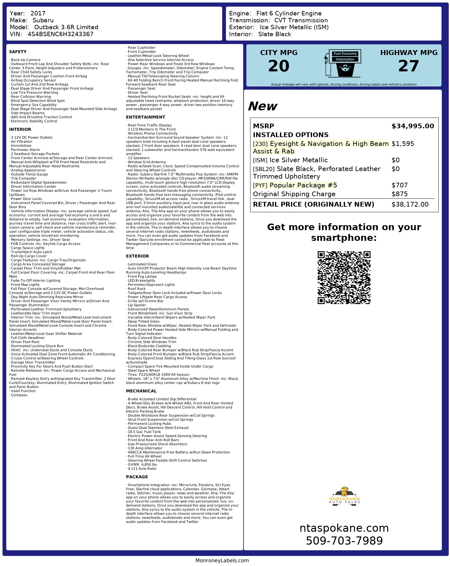 Discover exceptional value with this 2017 Subaru Outback Limited AWD, now available in Spokane, WA. Powered by a rugged and responsive 3.6L V6 gasoline engine, this Subaru Outback delivers confident highway power and capable all-weather performance thanks to Subaru's legendary all-wheel drive. Sporting premium features that elevate every drive, this Limited trim includes built-in Navigation, Satellite Radio, and a Back-Up Camera for seamless convenience and safety on every trip.