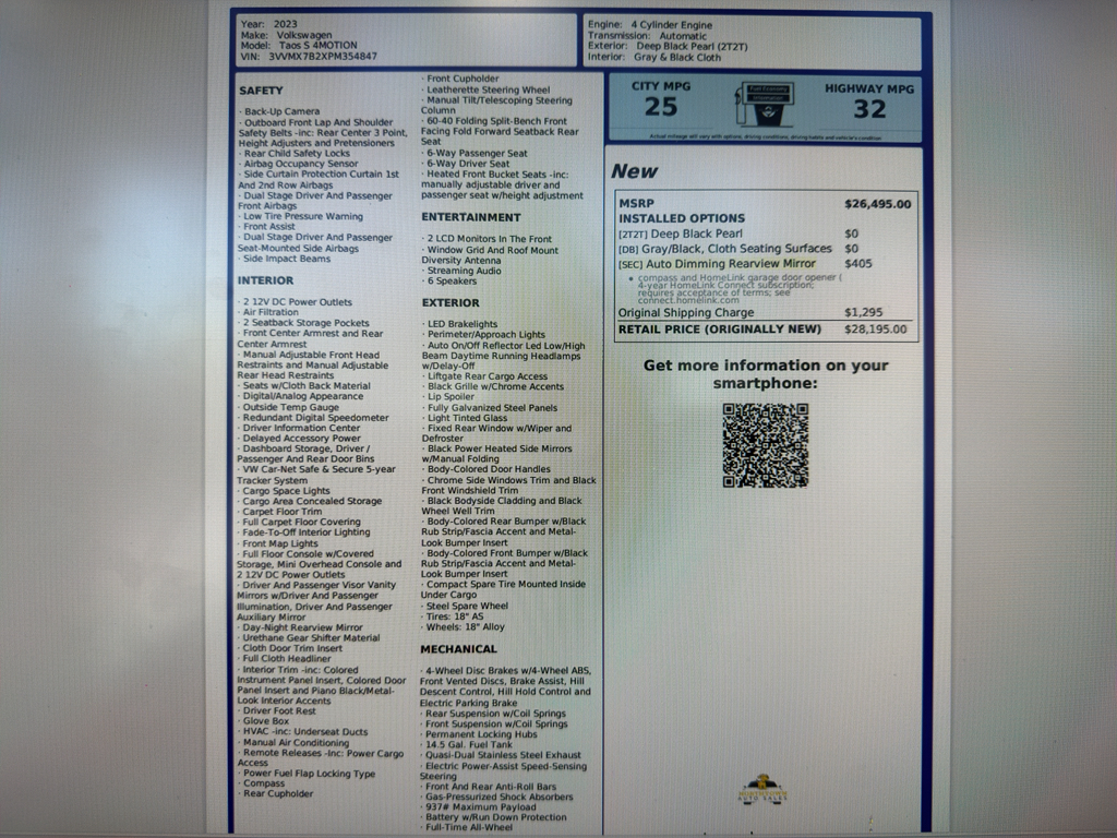 Safety and convenience are paramount in this Volkswagen Taos, equipped with a back-up camera to assist in tight parking spots and enhance overall security. As a CARFAX 1-Owner vehicle, it comes with the assurance of a well-documented history, further adding to its appeal. The 2023 Volkswagen Taos S 4Motion is the perfect blend of performance, style, and practicality, ready to meet the demands of your active lifestyle.